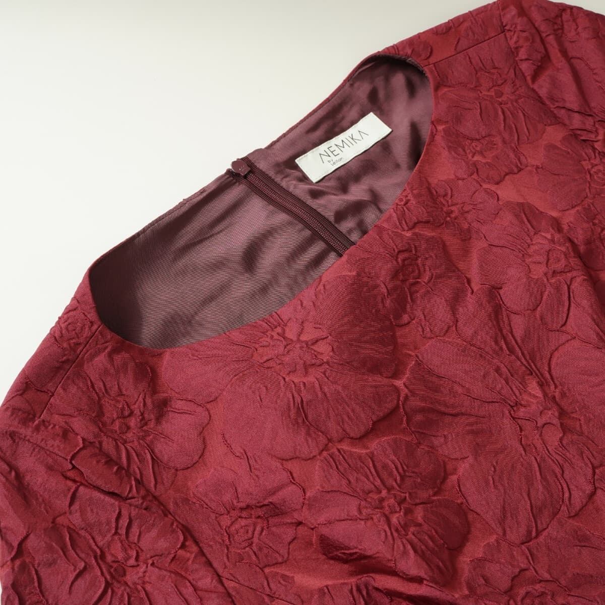 コメント:上品な自ネミカのワンピースです。凹凸のあるジャガード素材の上質な生地です。ボルドーワインレッドのようなシックなお色です。