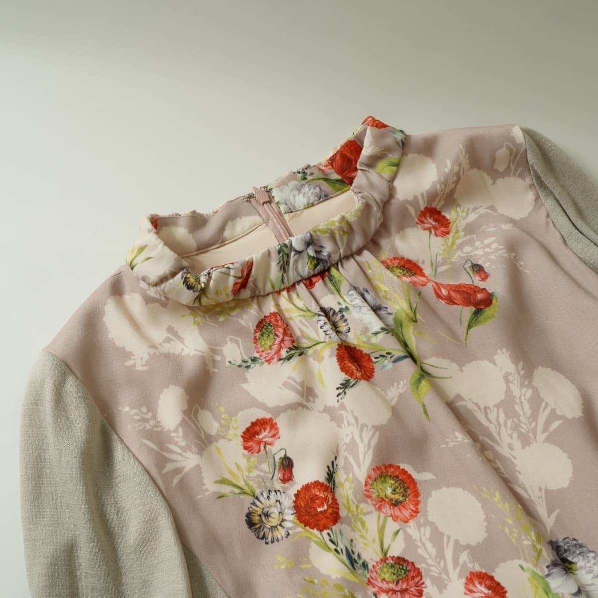 Sunauna スーナウーナ ワンピース 長袖 ひざ丈 タック ジャージー 切替 リボン フラワー 花柄 ベージュ ピンク