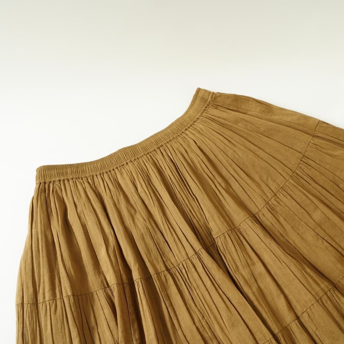 コメント:コットン100%のティアードスカート。同色同素材の裏地に、ウエストは総ゴムに紐のついたデザインです。