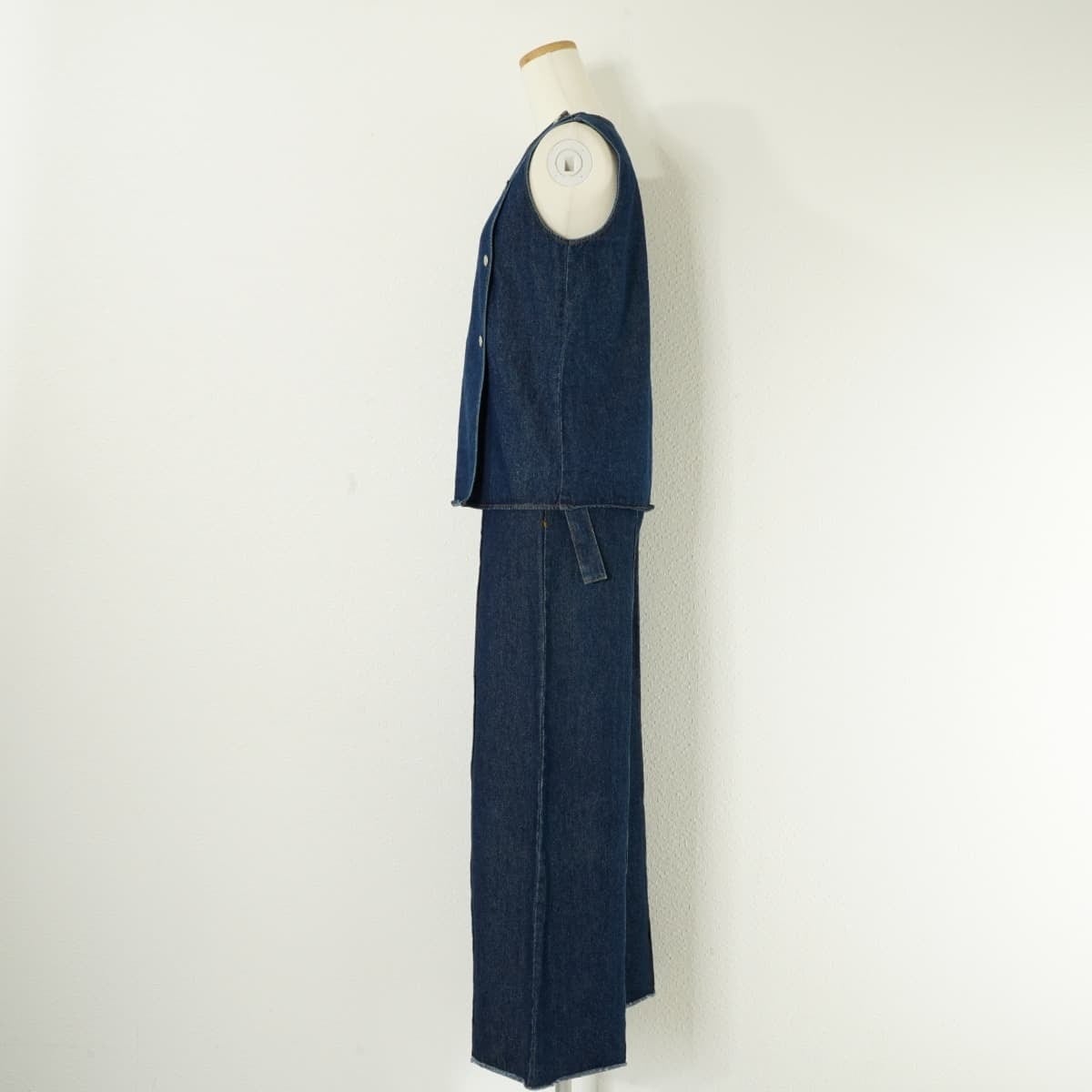 コメント:スナップボタンが目を惹くデニムセットアップ。ワイドパンツ・ベルト・ベストのセットです。トップスのスナップボタンは開閉が可能な仕様で、レイヤードのスタイリングも楽しめ、それぞれ単体でも着用が出来るので着回しの幅も広がるアイテムです。