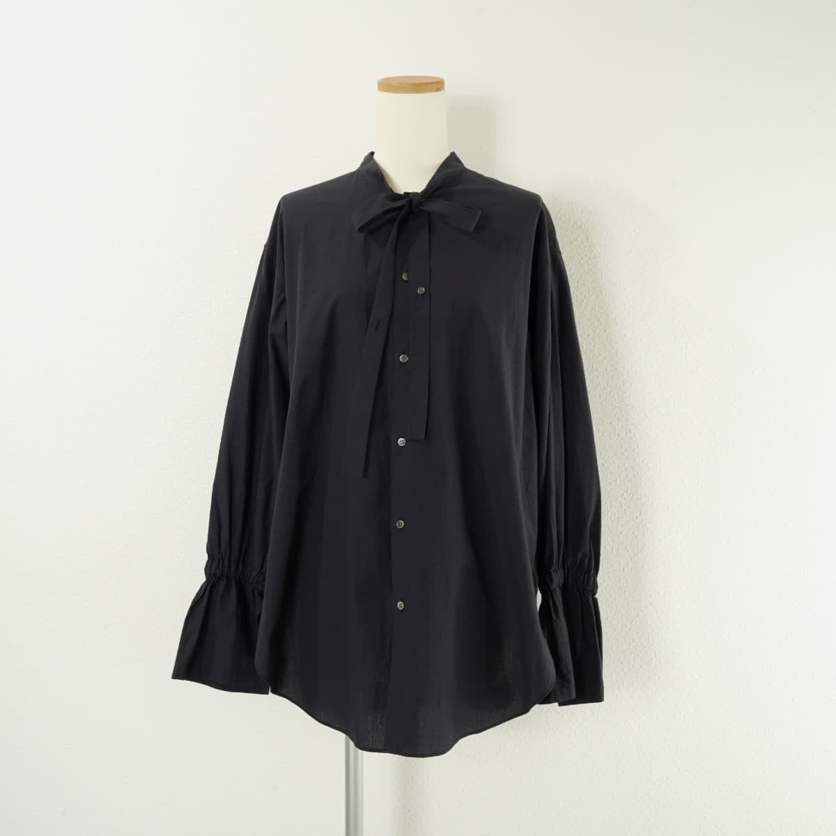 タイシャツはゆったりとしたボディにロング丈で、襟ぐりに配したボウタイはそのままラフに垂らしたり、リボン結びにしたりボタンで留めるなどさまざまにアレンジデザインです。