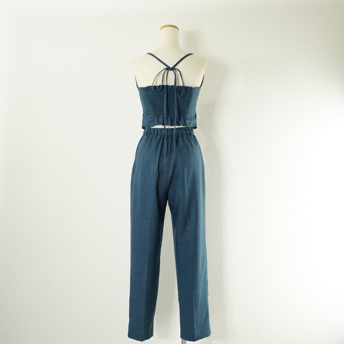 ビスチェはホルターネックに後ろはゴム仕様です。パンツはワイドにセンタープレス、ウエスト部分は後ろにゴム仕様のデザインです。
