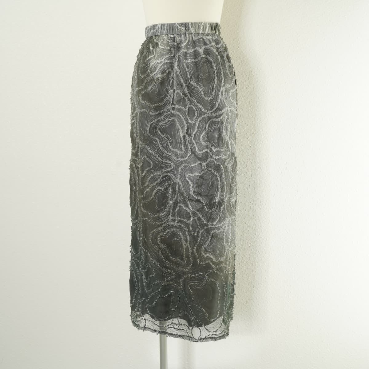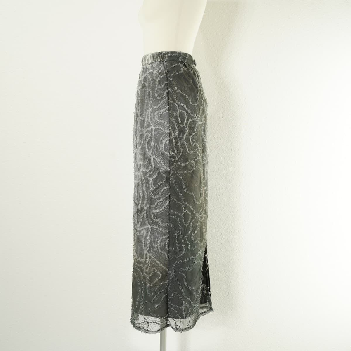 プリント下にもフリンジヤーンのオリジナル柄の刺繍を施した立体的な素材感と奥行きのある柄でフロントに深めのスリットデザイン。後ろウエストはゴム仕様です。