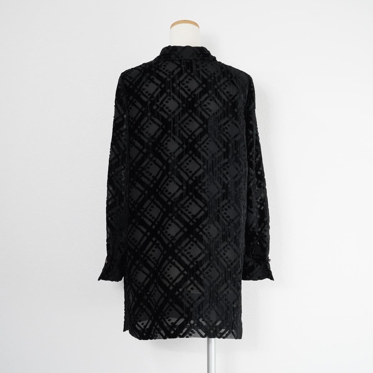 コメント:透け感のあるシアー素材にベルベットのような生地の模様を合わせたジャケットです。上品なアイテムです。ボタンホックで取り外しできる肩パットがあります。
