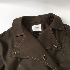 丈夫で重厚感のあるウールギャバジンの生地を日本国内で作成したアウター。配色のステッチと前立てカーブのディティールがAMERIらしく、たっぷりな分量の贅沢な生地使いは羽織るだけで存在感のある一着です。襟周りのボタンで雰囲気を変えてもご着用できるアイテムです。ウエストのリボンは取り外しできます。