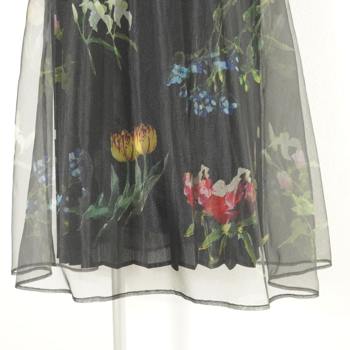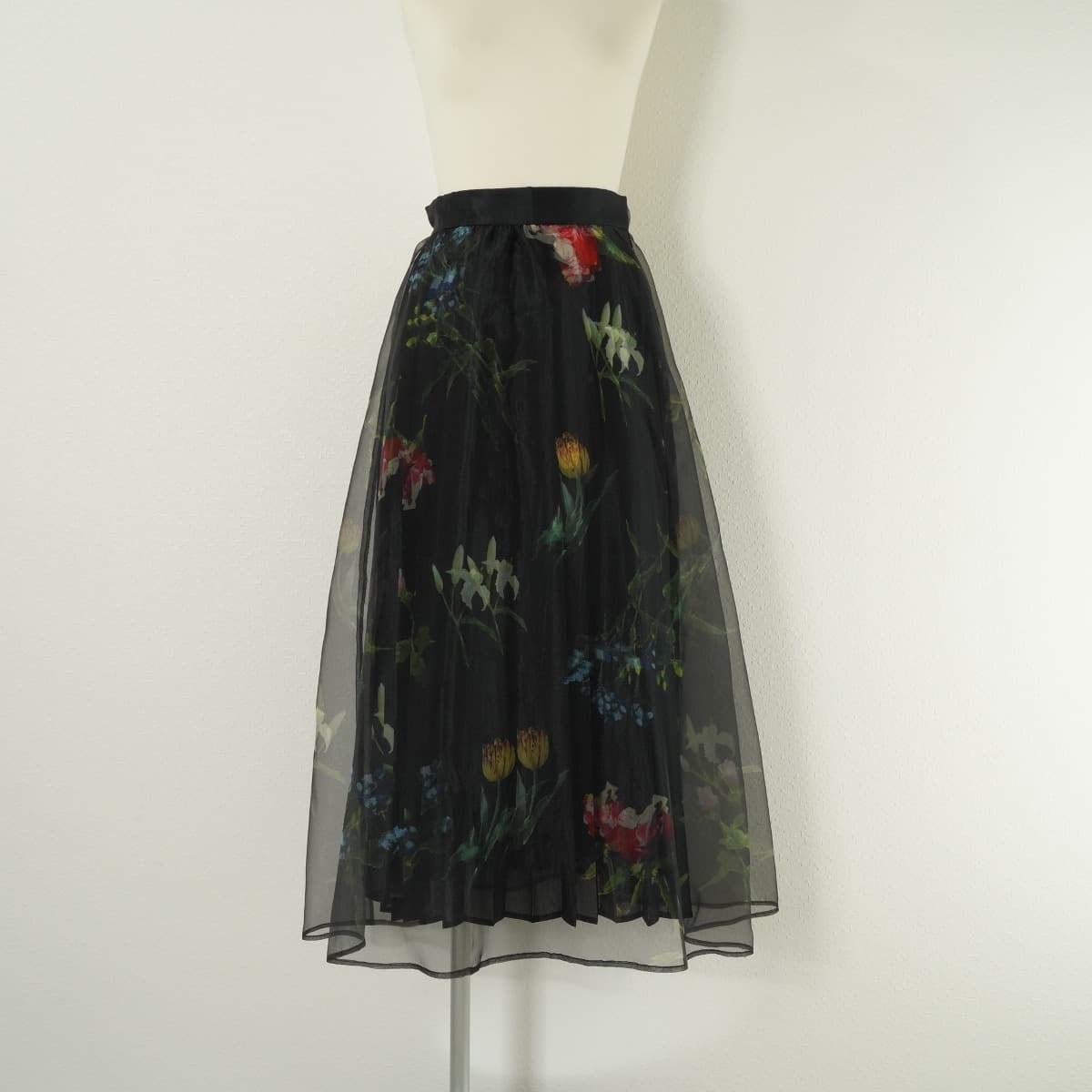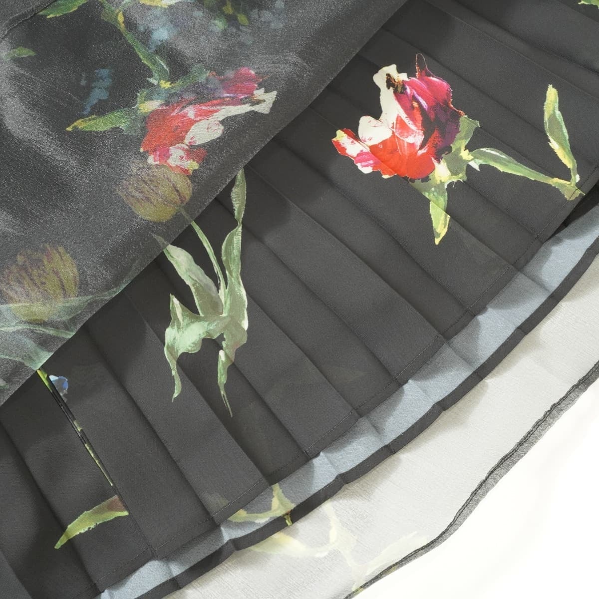 春夏に咲く花々をアクリル絵具で描き上げ、あえてべたっと粗いタッチにすることで、絵の具で出来る立体感をプリントに落とし込んだデザインです。プリーツスカートとオーガンジーを重ねることで、立体感を強調されています。ウエストは後ろがゴム仕様となっております。