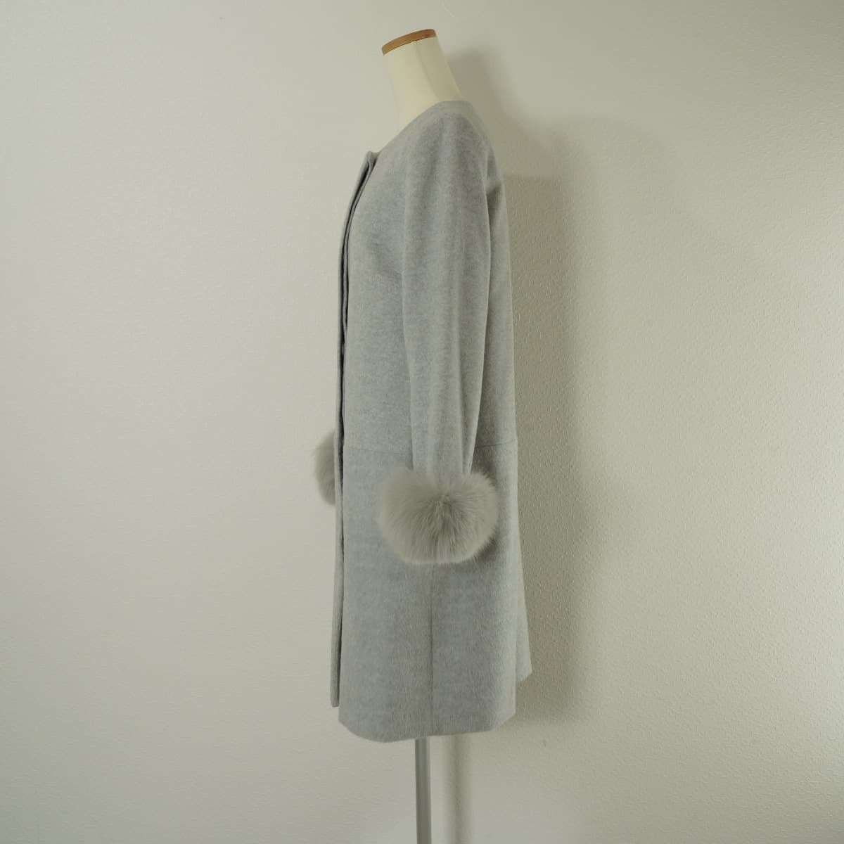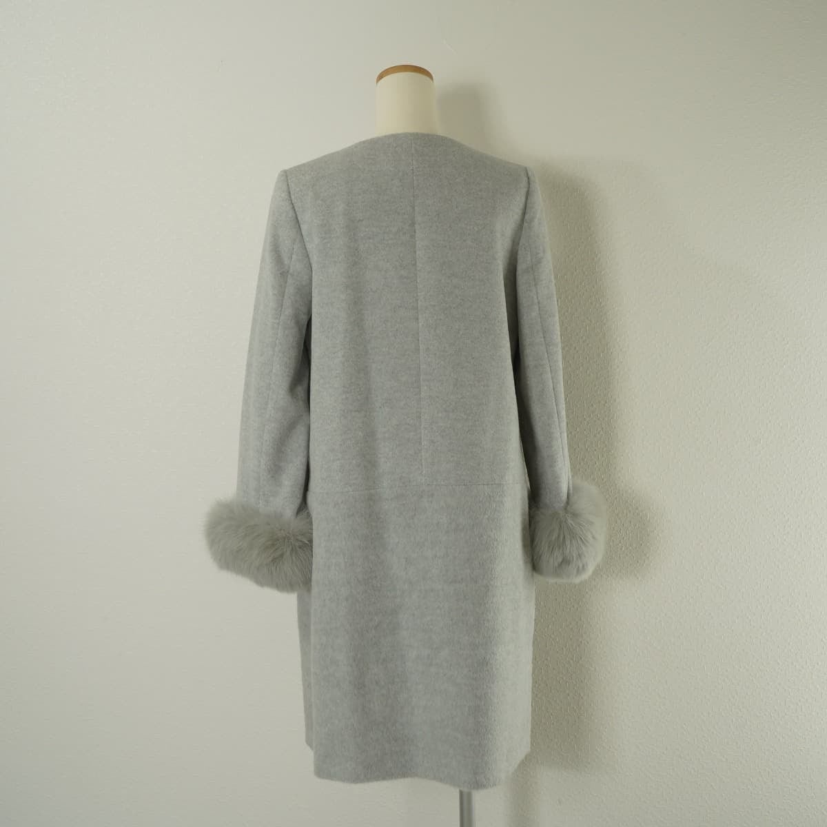 コメント:ボリューミーな袖のフォックスファー、すっきり縦長シルエットのロング丈のエレガントなノーカラーコート。