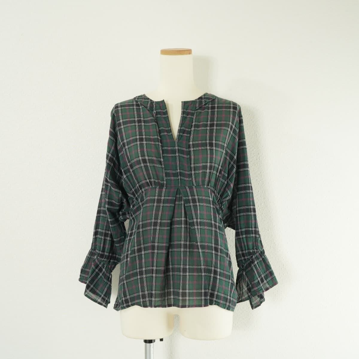 コメント:グリーンのチェック柄のプルオーバーブラウス。ゆったりめのドルマンスリーブで、袖口はシャーリングにフレアのスリットのあるデザインです。ウエストマークのリボンが特徴のアイテムです。